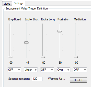 To change the conditions that will trigger the Engagement video, use the sliders and slider status boxes. There is one slider/status box pair for each Affectiv signal: Engagement/Boredom, Short Term Excitement, Long Term Excitement, Frustation, and Meditation.