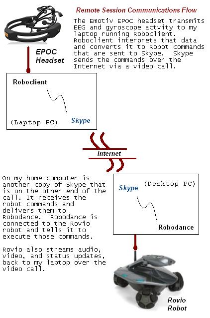 The diagram at the left gives you an overview of how everything hooks together to create a remote session using a Skype video call. If you want a really in-depth description of what I did to add support to Robodance for the EPOC headset, please read my article on ExtremeTech on the Emotiv Systems SDK which contains a ton of screen-shots, sample source code, and detailed discussion of how the system was implemented and how it works, including my comments on performance and usability.