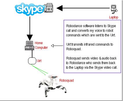 [04-24-2010] - Note this page talks about an older demonstration I did where retrofitted my Roboquad robot act as a remote spy robot using Skype. It was a custom hack that was never meant to be used by anyone but myself and a few others. It has been completely replaced by Rovio which was designed from the ground up to be a WiFi enabled mobile spy robot that is controlled remotely over the web. Read more about Robodance’s support for this terrific robot on the Home page.